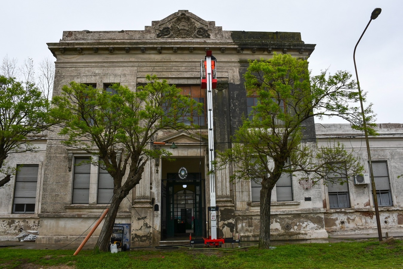 Se llevan a cabo trabajos de hidrolavado del frente, pintura y revoque de paredes, así como también reparaciones en aulas y espacios de la planta superior, que resultaron dañados por el temporal de marzo de 2024.