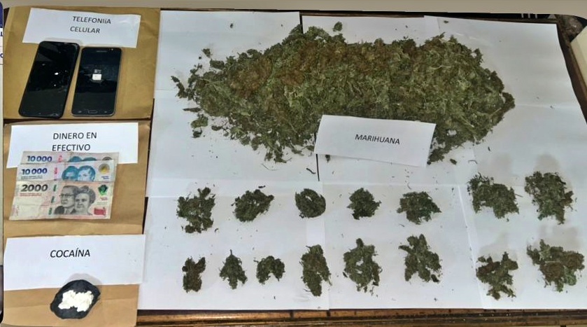 En el lugar se procedió al secuestro de 5,40 kilos de marihuana y un envoltorio de 6,2 grs. De cocaína, un teléfono Motorola y otro marca Samsumg, junto a la suma de $ 22.000.