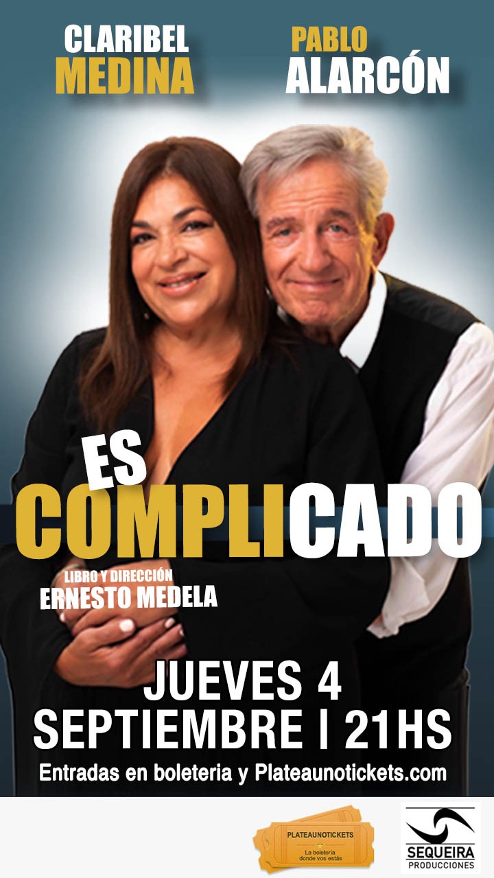 La querida dupla actoral, Pablo Alarcón y Claribel Medina, vuelve a reunirse en escena, luego de una gran cantidad de años, con “Es Complicado”, un texto que también le dejarà su lugar al humor y a la emoción.