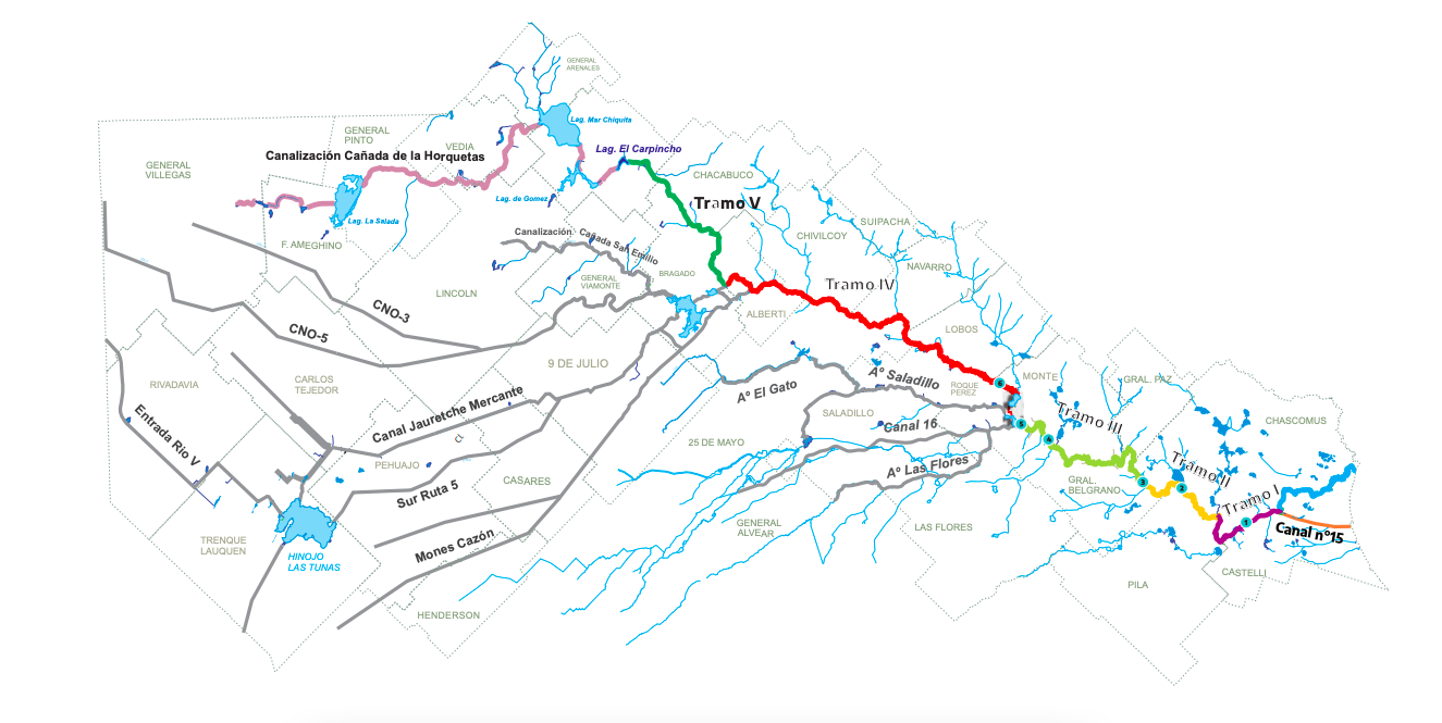 Las etapas 1 y 2 del tramo 5 atraviesan distritos del noroeste de la provincia, puntualmente Alberti, Bragado y Chacabuco, y permitirá recuperar unas 400 mil hectáreas productivas, como en su momento explicó el Ing. Pedro de las Barreras, cuando junto a la ex senadora Eugenia Gil trabajaban sobre el tema.