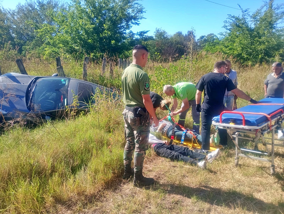 Personal policial del puesto de Vigilancia de La Limpia se moviliza hacia la zona de Máximo Fernández, donde en proximidades de la estación, se produjo un vuelco, que dejó tres personas heridas.